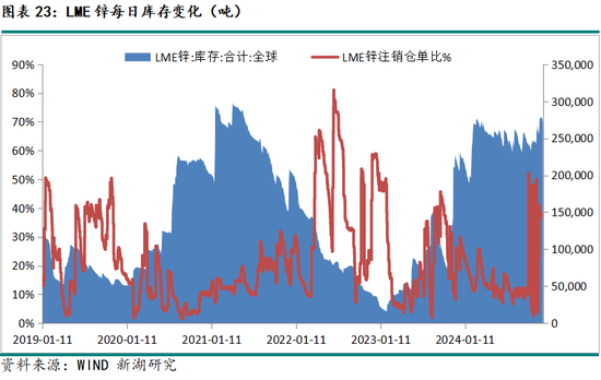 国内方面,截止12月20日,上期所锌锭库存大幅降至40137吨,较去年同期增长14697吨,SMM七地锌锭社会库存至8.22万吨,较去年增长0.79万吨,整体上,24年底国内库存水平仅高于前两年、仍位于历史相对低位。2024 年上半年国内库存累库幅度以及累库长度都略微超预期,主要在于高锌价抑制了下游的补库需求,三季度随着锌价回落及国内炼厂明显减产,锌锭去库斜率再次陡峭。